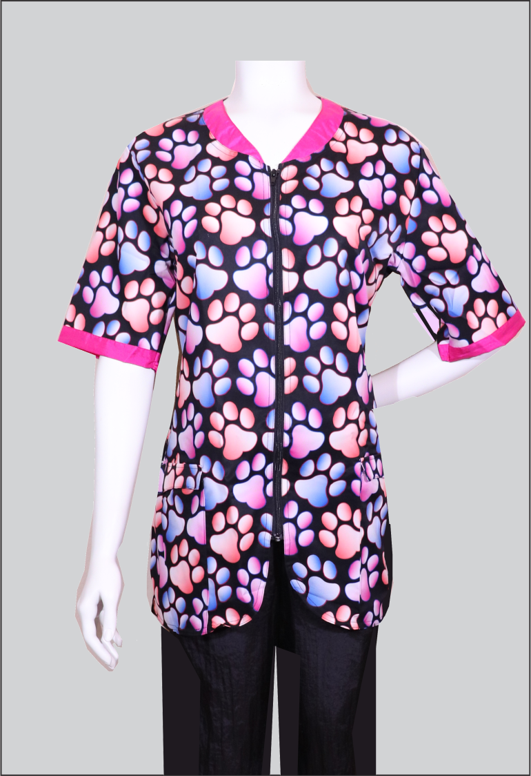 Jacket has silk like feel, rounded collar, zipper front, two covered front patch pockets, adjustable back tunnel belt and side slits. Contrasting color at collar, zipper, sleeve hem and back. Printed front, sleeves, & back belt.